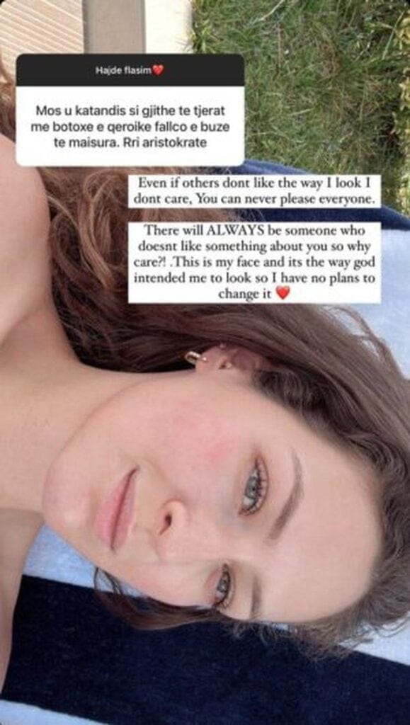Françeska Murati, ish-banorja e BBV3 u ka kushtuar kohë ndjekësve të saj në Instagram këtë të diel për të biseduar. Mes bisedës virtuale ka patur dhe disa kërkesa që ndjekësit i kanë drejtuar Françeskës. Një prej tyre i ka kërkuar që ajo të qëndrojë ashtu siç është, pa botox, qerpikë falso e fillera që sipas tij shumë të tjera janë katandisur.