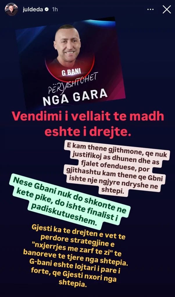 Një ndër komentet e para ka ardhur nga Juli Deda, i cili ka ndarë një mendim të qartë në lidhje me vendimin. Ai ka theksuar se nuk justifikon as dhunën dhe as fjalët ofenduese, por njëkohësisht ka pranuar se G Bani ishte një lojtar ndryshe në këtë edicion. “Vendimi i vëllait të madh është i drejtë. E kam thënë gjithmonë që nuk justifikoj as dhunën dhe as fjalët ofenduese, por gjithashtu kam thënë që G Bani ishte një ngjyrë ndryshe në shtëpi,” shkruan ai.