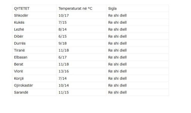 Moti parashikohet me vranësira mesatare deri të dendura si dhe alternime të herëpashershme kthjellimesh (diell) kryesisht përgjatë ultësirës perëndimore. Vranësirat do të shoqërohen me reshje shiu të herëpashershme me intensitet kryesisht të ulët dhe në periudha afatshkurtra dhe lokalisht reshjet me intensitet deri mesatar.