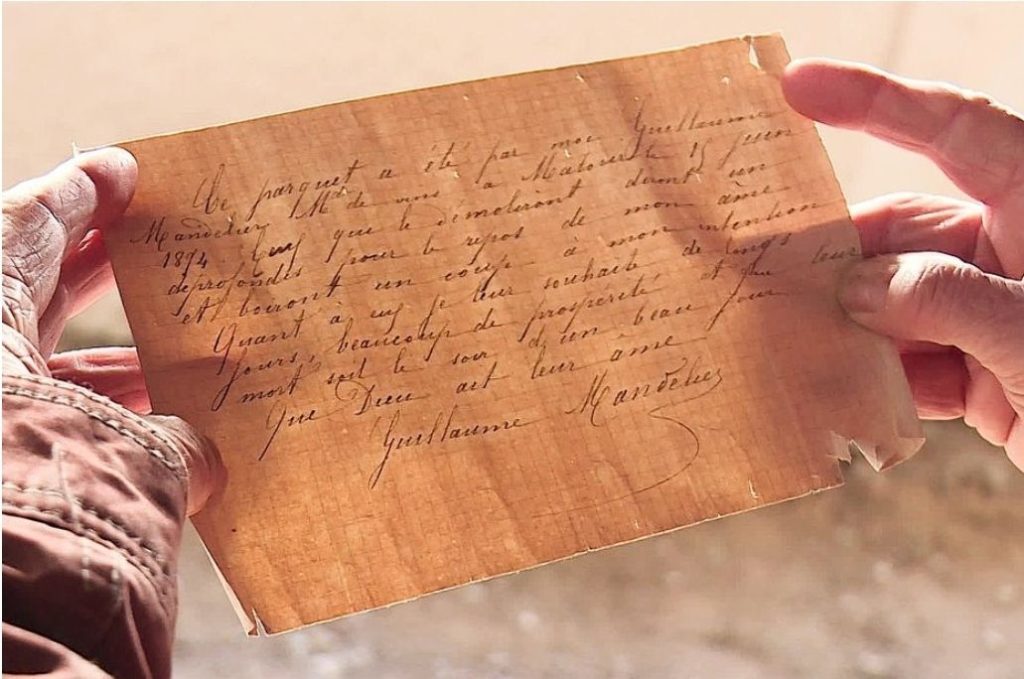Kur hoqi dyshemenë e vjetër të drurit, Mollier gjeti një lloj kapsule kohe: një shishe kristali me një dorëshkrim brenda. Fillimisht, artizani nuk i dha rëndësi, duke menduar se ishin plehra, por kur e hodhi, e kuptoi se kishte diçka brenda.