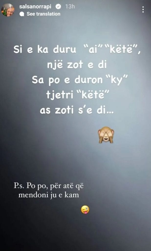 Aktori i humorit, Salsano Rrapi ka provokuar debat në rrjet me një deklaratë që ka bërë. “Si e ka duru ai këtë një Zot e di. Sa po e duron ky tjetri këtë as Zoti s’e di… Po po, për atë që mendoni ju e kam”, shkruan Salsano në një postim në Instagram Story.