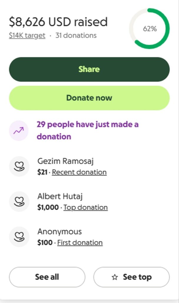 Në “Gofoundme” deri më tani janë mbledhur 8,626 dollarë nga 31 donacione, ku bie në sy se ka persona që kanë dhuruar shuma prej 1000 dollarë.
